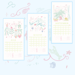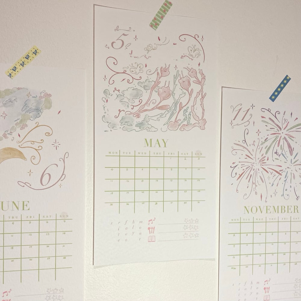 A hand-illustrated wall calendar printed on120gsm Hammer White for a soft, lightly textured finish.Each sheet features unique seasonal artwork in pastel tones.